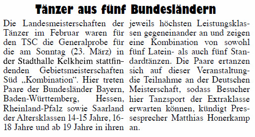 Artikel vom 19. Feb. zur Landesmeisterschaft "Tänzer der Spitzenklasse in der Stadthalle"